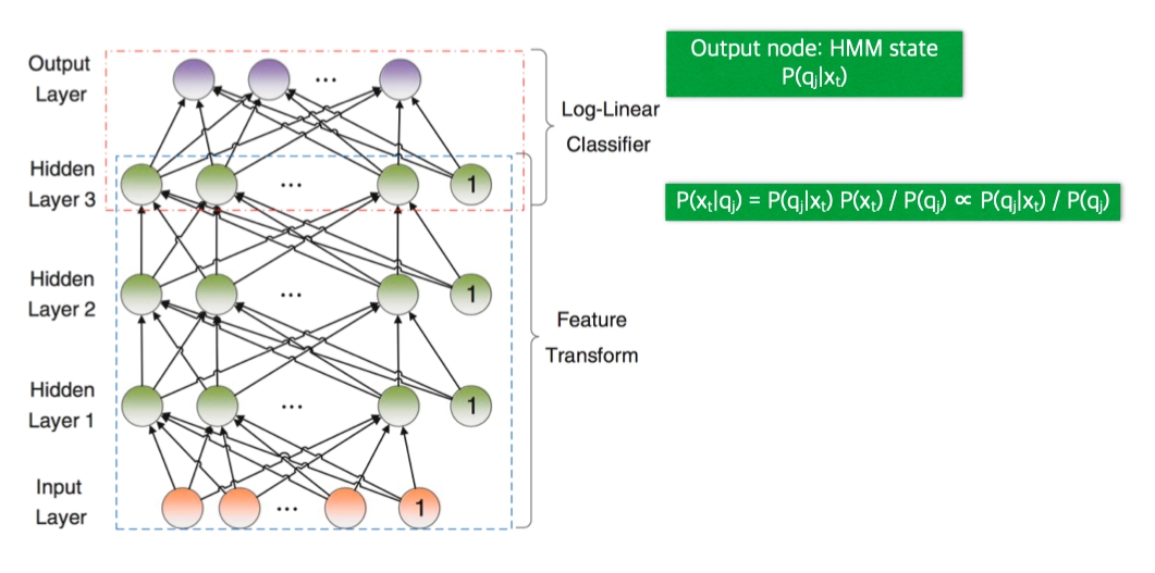 추출한 MFCC 가 입력값이 되며 은닉층의 수는 5~8개를 사용하며, 각 은닉층마다 2,048개의 노드를 사용한다. 출력층은 하나의 tied state로 대응되는데 tied state는 음운학적으로 유사한 조합의 단위이며, decision-tree 기반의 state clustering 기법이 주로 사용되고 있다 최종 tied state 수는 tree의 크기에 따라 결정되나, 일반적으로 최적의 크기가 6,000~10,000개인 경우로 알려져 있다.