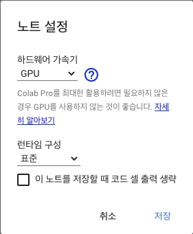 우선적으로는 상단 메뉴에서 런타임 - 런타임 유형 변경 탭으로 진입하여 하드웨어 가속기가 GPU 로 설정되어 있는지 확인해야 한다.