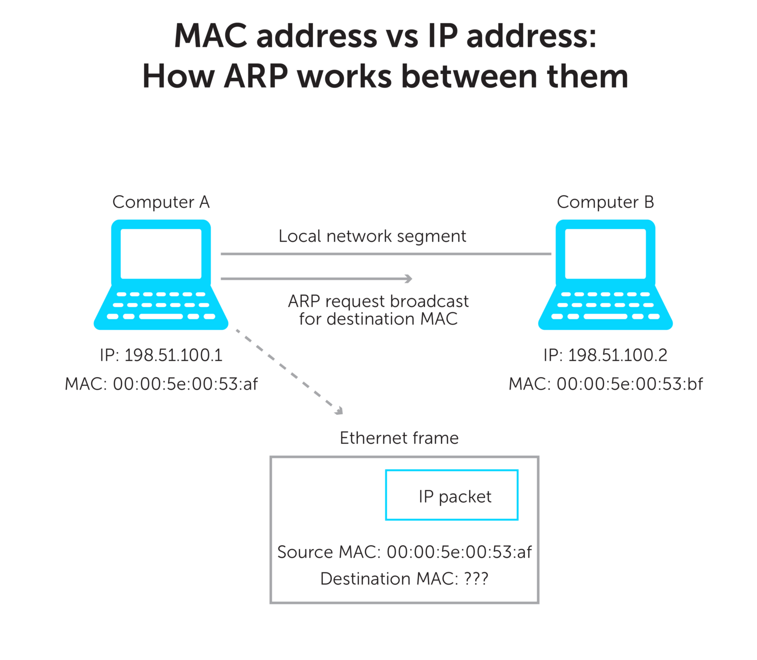 이렇게 중계하는 동안에는 다음으로 중계할 곳의 MAC 주소를 사용하여 목적지를 찾아가게 되며, 이때 ARP (Address Resolution Protocol) 이라는 프로토콜이 사용된다. ARP 는 수신지의 IP 주소를 바탕으로 MAC 주소를 조사할 수 있다.