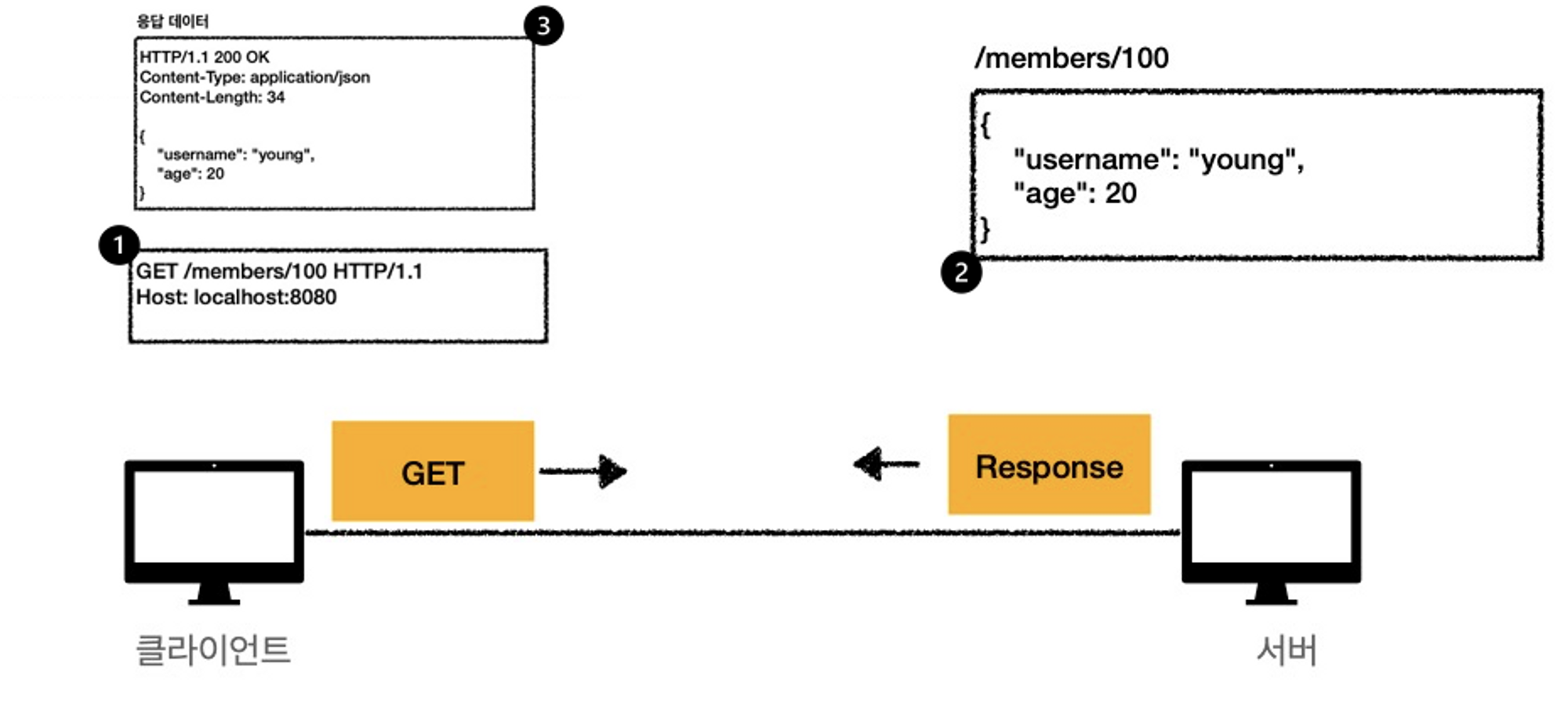 GET 은 서버에 요구하는 메소드의 종류를 의미하며, /members/100 은 리소스를 의미한다. (이 리소스를 리퀘스트 URI 라고 한다.)