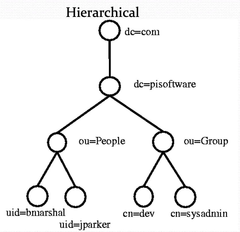 - 각 엔트리는 DN(Distinguished Name) 이라는 고유한 값으로 지칭
